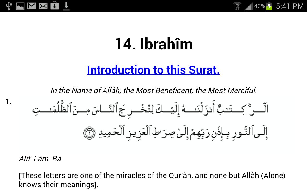 Source (google.com.pk)This is the main Qur'an version at sacred-texts.com. The Arabic is presented as embedded graphics in the GIF format. To allow for viewing on slower systems, each Surah is broken down into traditional sections, which usually include about a dozen verses. Each verse is presented in Arabic along with a pronunciation guide, and The Yusuf Ali English text. The system used in the pronunciation guide can be viewed in this file. This text is hyperlinked with other English versions and transcriptions of the Qur'an at this site.